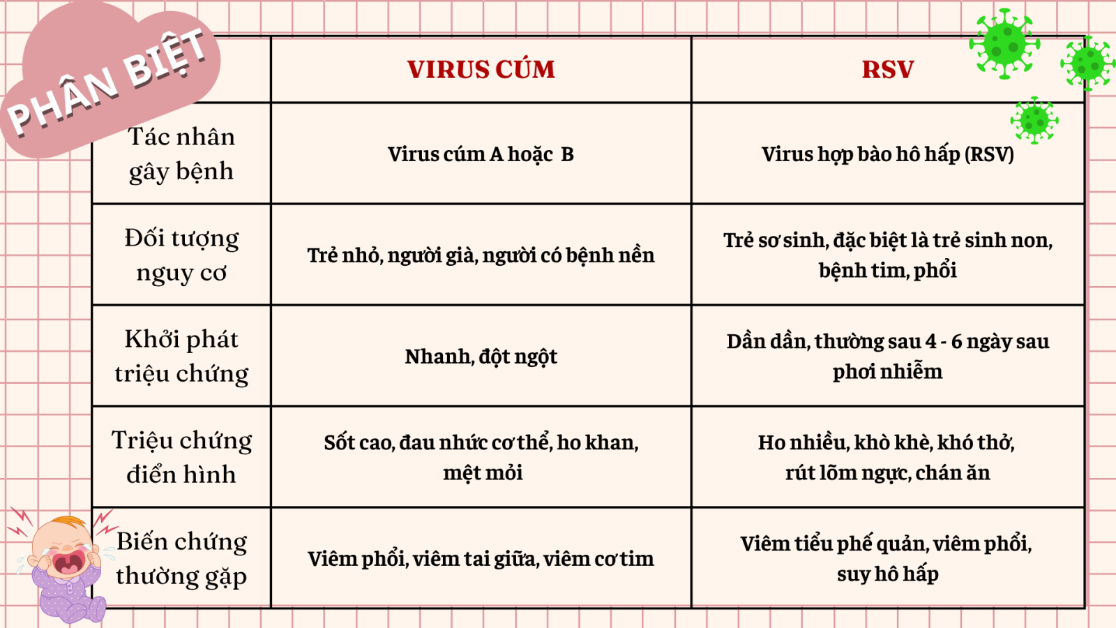 👉 Nếu trẻ sốt cao, thở nhanh, ho kéo dài, khò khè hoặc bỏ bú, cha mẹ cần đưa trẻ đến cơ sở y tế để được khám và chẩn đoán chính xác. Việc phân biệt đúng giữa cúm và RSV giúp bác sĩ chọn hướng điều trị phù hợp, tránh biến chứng đáng tiếc./.