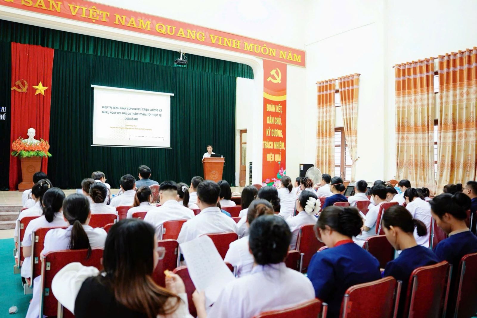 Tại buổi sinh hoạt khoa học, không khí trao đổi diễn ra sôi nổi và cởi mở. TS.BS Hoàng Thủy đã trực tiếp phân tích, làm rõ nhiều vấn đề chuyên môn sâu; cập nhật khuyến cáo mới trong điều trị bệnh COPD và giải đáp thấu đáo các câu hỏi, tình huống thực tế mà bác sĩ gặp phải trong quá trình điều trị.
