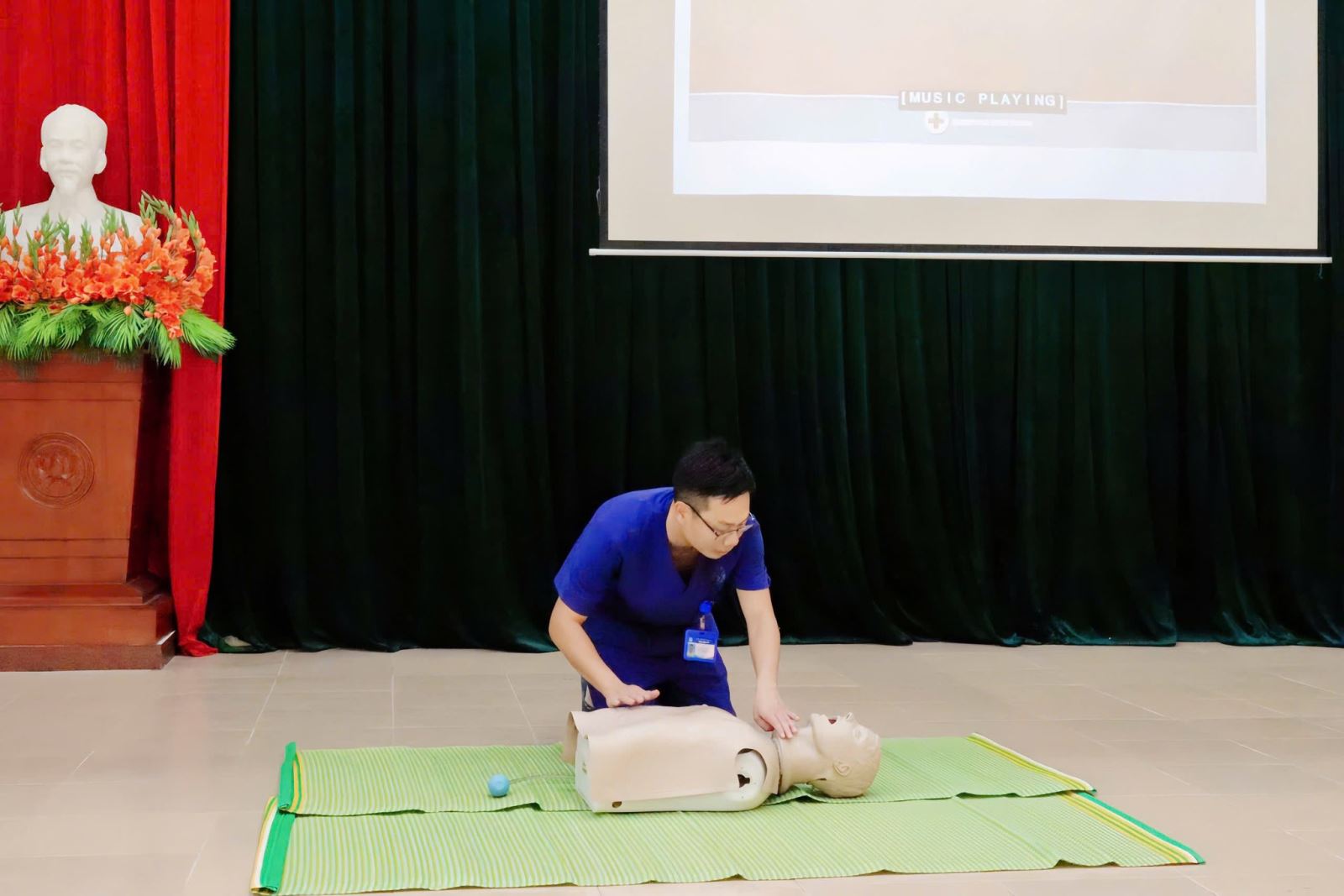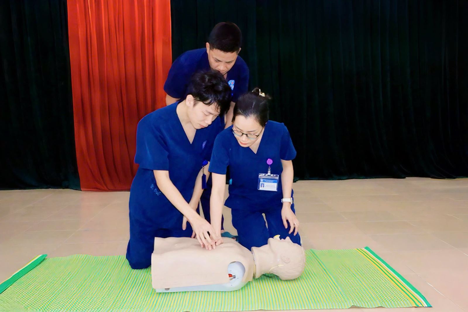 Tại buổi tập huấn, BSCKI. Võ Đình Thiện – Trưởng Khoa Hồi sức tích cực – Chống độc đã hướng dẫn các kỹ năng cấp cứu ngừng tuần hoàn, giúp nhân viên y tế nắm vững cách phát hiện sớm, nhận biết bệnh nhân ngừng tuần hoàn và thực hiện đúng quy trình CPR trong thực tế. Đồng thời, các y bác sĩ cũng được thực hành trên mô hình mô phỏng, trao đổi kinh nghiệm và xử lý tình huống thực tế, nâng cao khả năng ứng phó hiệu quả trong cấp cứu.
