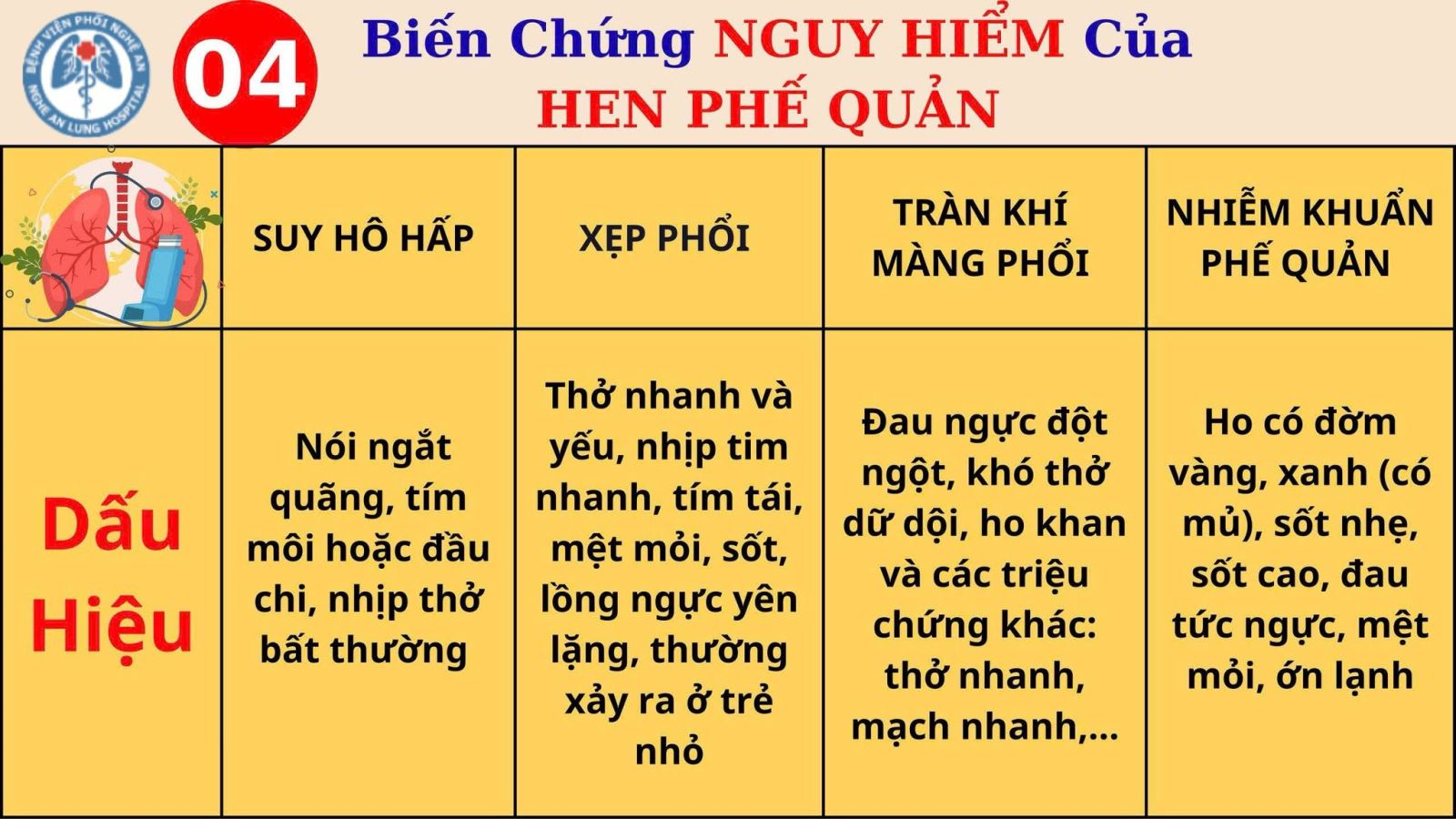 Trong cơn hen cấp, người bệnh khó thở dữ dội, nói ngắt quãng, vã mồ hôi, tím tái – đó là dấu hiệu báo động suy hô hấp cấp, biến chứng nguy hiểm nhất có thể khiến bệnh nhân ngừng thở chỉ trong vài phút. Một số trường hợp khác có thể gặp tràn khí màng phổi, khi không khí rò rỉ vào khoang ngực gây xẹp phổi và chèn ép tim, phổi – tỷ lệ tử vong có thể lên đến 5% nếu không cấp cứu kịp. Ngoài ra, xẹp phổi và nhiễm khuẩn phế quản thường gặp ở người hen nặng, đặc biệt là trẻ em dễ xảy ra hơn do đường thở nhỏ, làm bệnh tiến triển nhanh dẫn đến tâm phế mạn tính, khiến người bệnh phải sống phụ thuộc vào oxy.