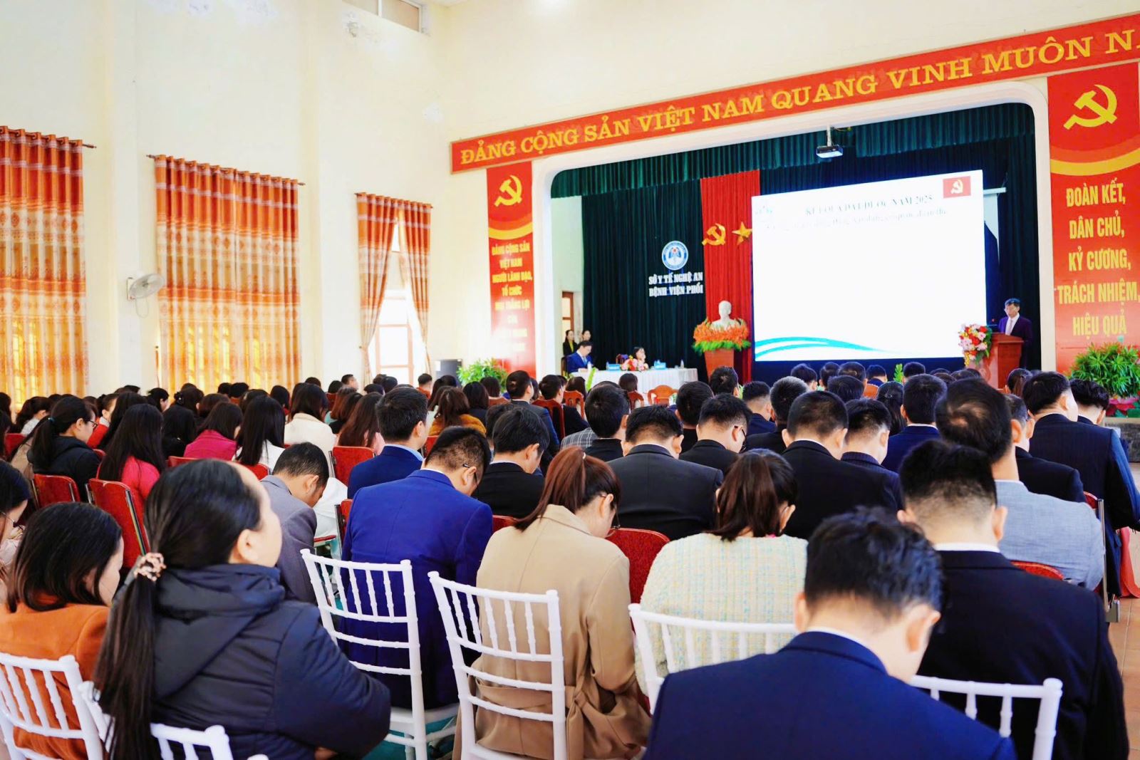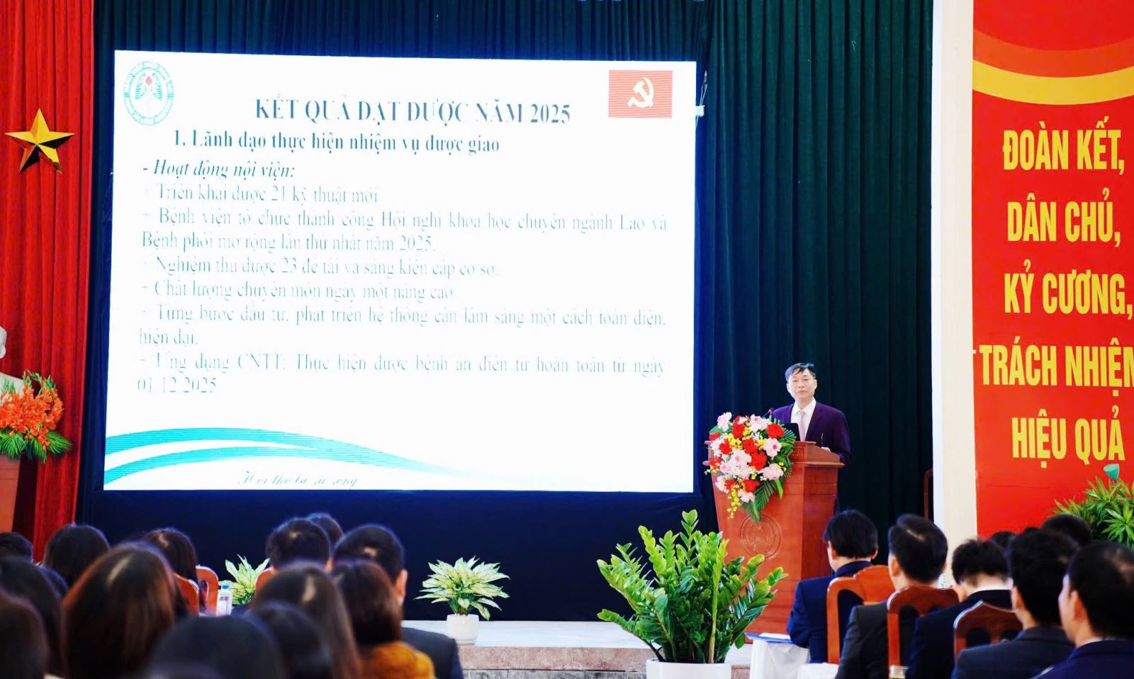 Năm 2025, Đảng bộ Bệnh viện Phổi Nghệ An đã phát huy tinh thần đoàn kết, trách nhiệm, nỗ lực hoàn thành tốt các nhiệm vụ chính trị và chuyên môn được giao. Bệnh viện duy trì quy mô 580 giường bệnh theo kế hoạch, 806 giường thực kê với công suất sử dụng đạt trên 110%, tiếp nhận 68.428 lượt khám chữa bệnh, tăng 6,11% so với năm 2024.