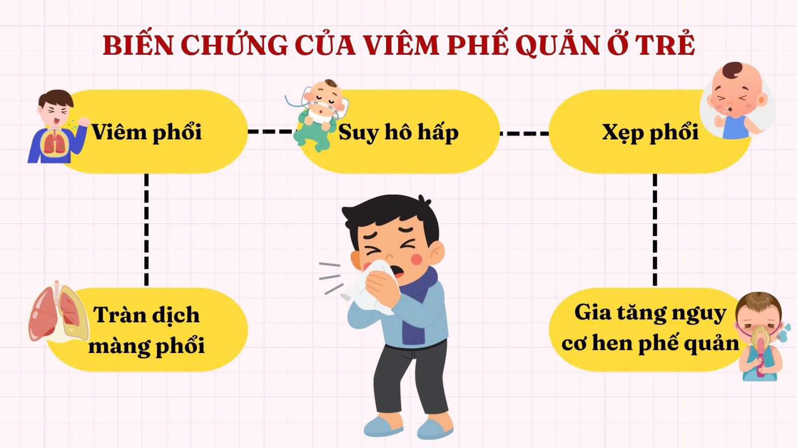 Mặc dù viêm phế quản thường diễn biến nhẹ nhưng có thể tiến triển nhanh khiến bố mẹ chủ quan, bỏ lỡ “thời điểm vàng” điều trị gây ra những biến chứng nguy hiểm ảnh hưởng đến hệ hô hấp của trẻ.