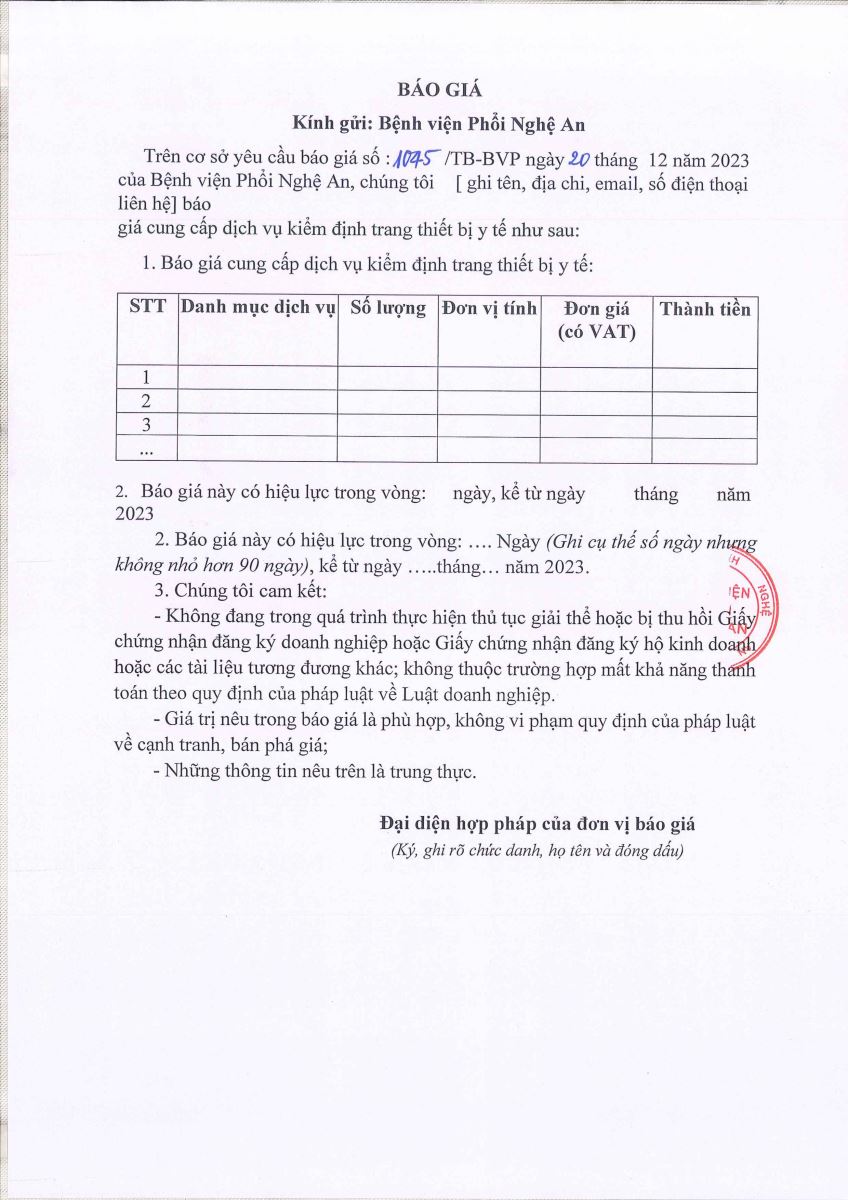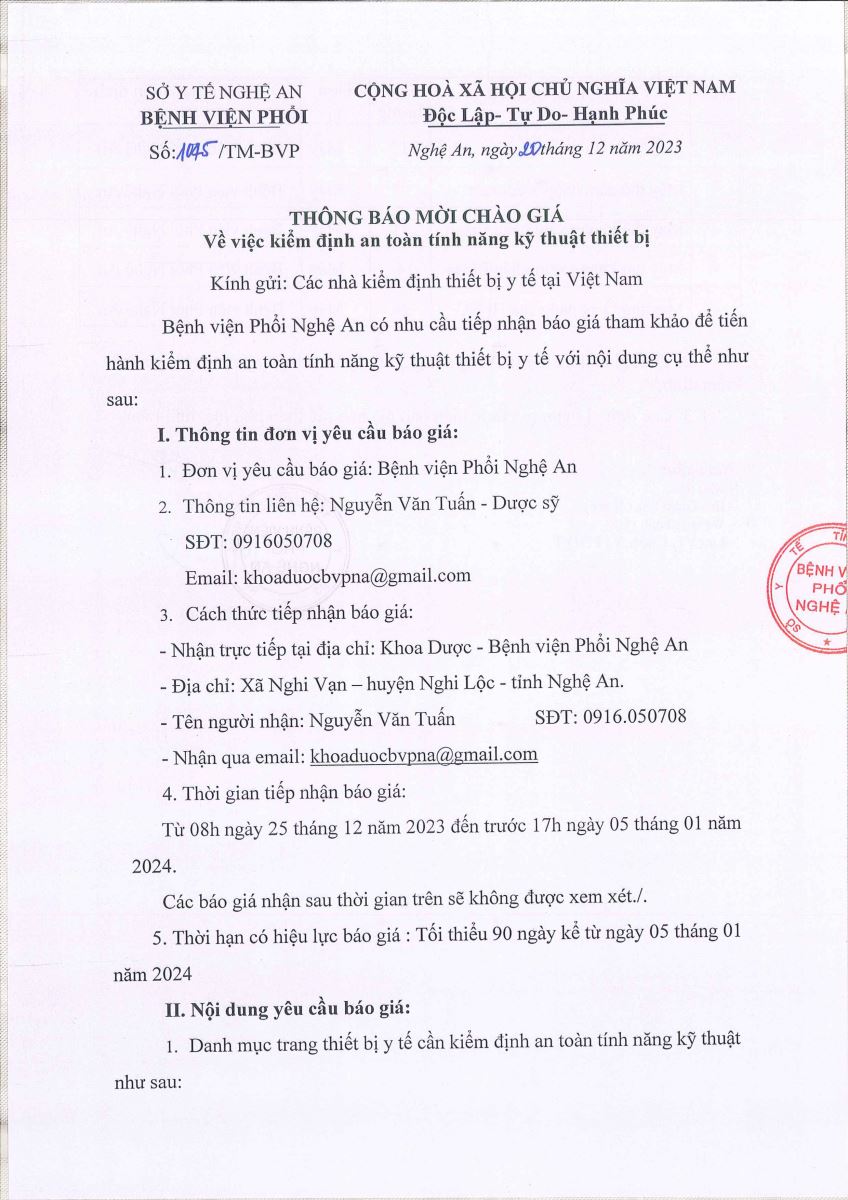 THÔNG BÁO THƯ MỜI CHÀO GIÁ SỐ 1045/TM-BVP NGÀY 20 THÁNG 12 NĂM 2023